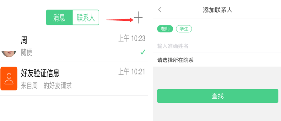 3.0版另外一大更新,就是新增了“消息”这个界面,里面可以通过搜索“姓名”和“院系”来添加联系人成为好友,然后就可以在里面和好友聊天啦!这个功能可是很强大的哟,只要是咱们APP的用户,都可以在上面查找的到哟!