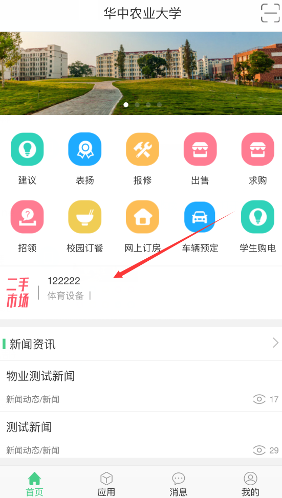 首页的整体布局和2.0版APP相似,在图标和颜色上做了细微调整,更加的小清新,另外在下方的新闻、服务、报修等版块的布局也有所调整。首页最大的改动是增加了一个可以滚动播放资讯的版块,这样更便于大家在主界面上发现热门资讯。首页最下方还有“应用”“消息”“我的”三个选择页面。