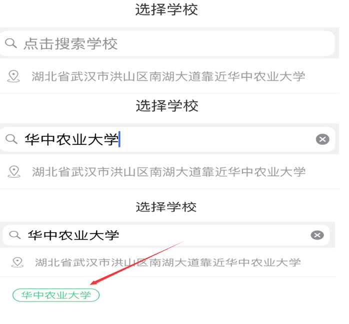 之后会进入到一个选择学校的操作界面,麻溜的输入“华中农业大学”搜索,下方会出现绿色的“华中农业大学”字样,点击即可进入到我农的登录界面。