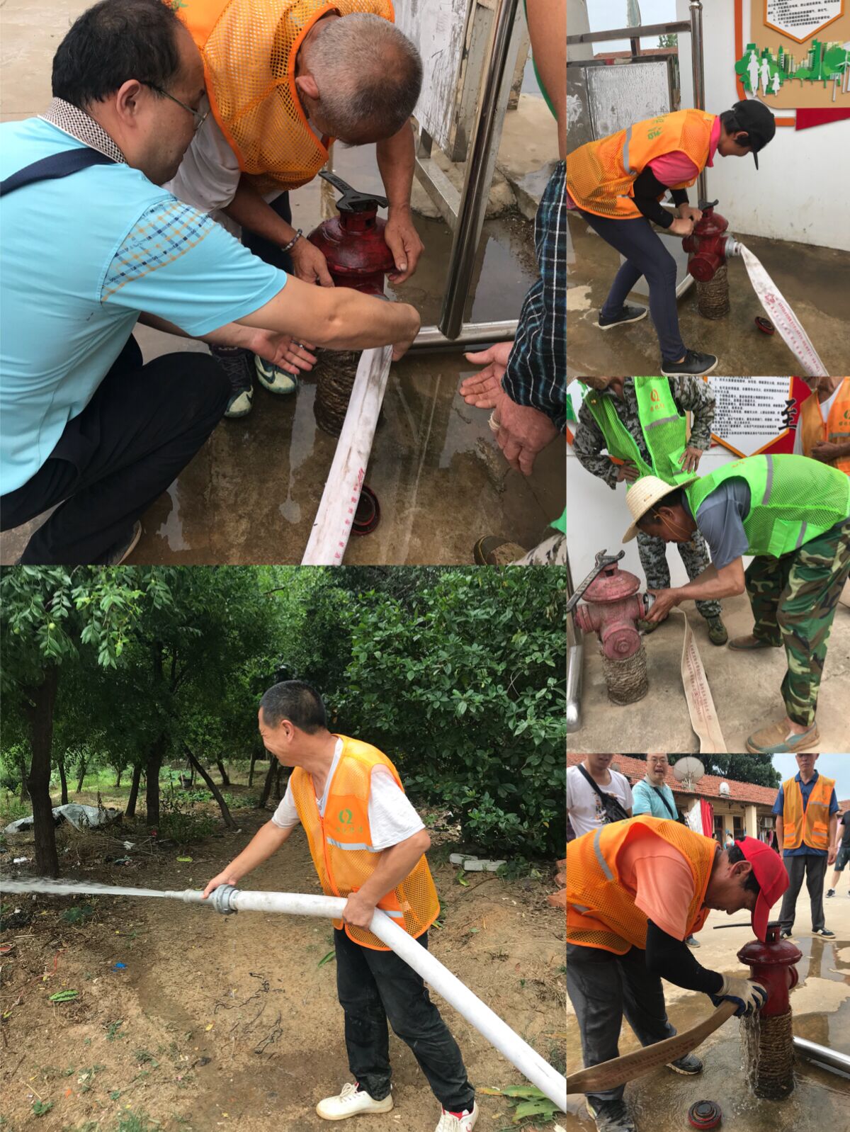 随后,工人们两人一组分工协作进行模拟演练,一人负责铺设水带,将水带一端与消火栓连接,另一人拿着水带的另一端迅速向火场方向跑去,边跑边安装水枪。连接成功后,缓慢打开消火栓阀门,2人前后握紧水枪,对准火苗根部进行灭火。演练结束后,工人们将水带卷成盘状,放回消防屋内。整个消防演练持续一个小时,虽然工人们年纪较大,但都积极踊跃地参与演练,动作连贯迅速,现场井然有序。