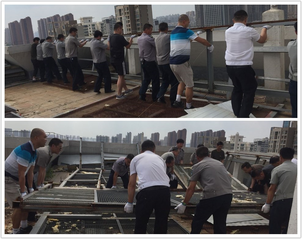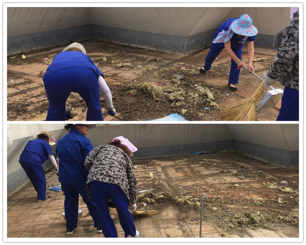 5月16日下午,西苑三期物业主任周洪波联合各项目安保队长、队员共同清理了西苑58栋顶楼拆卸的鸽子笼堆放物,大家团结合作、齐心协力将大件堆放物移至天台两端。经过一个小时的奋战,杂物终于清理完毕,保洁师傅们齐上阵清扫地面堆积已久的鸽子粪,并对天台地面进行清洗,为下一步彻底清杂和安装晾衣架做好准备。