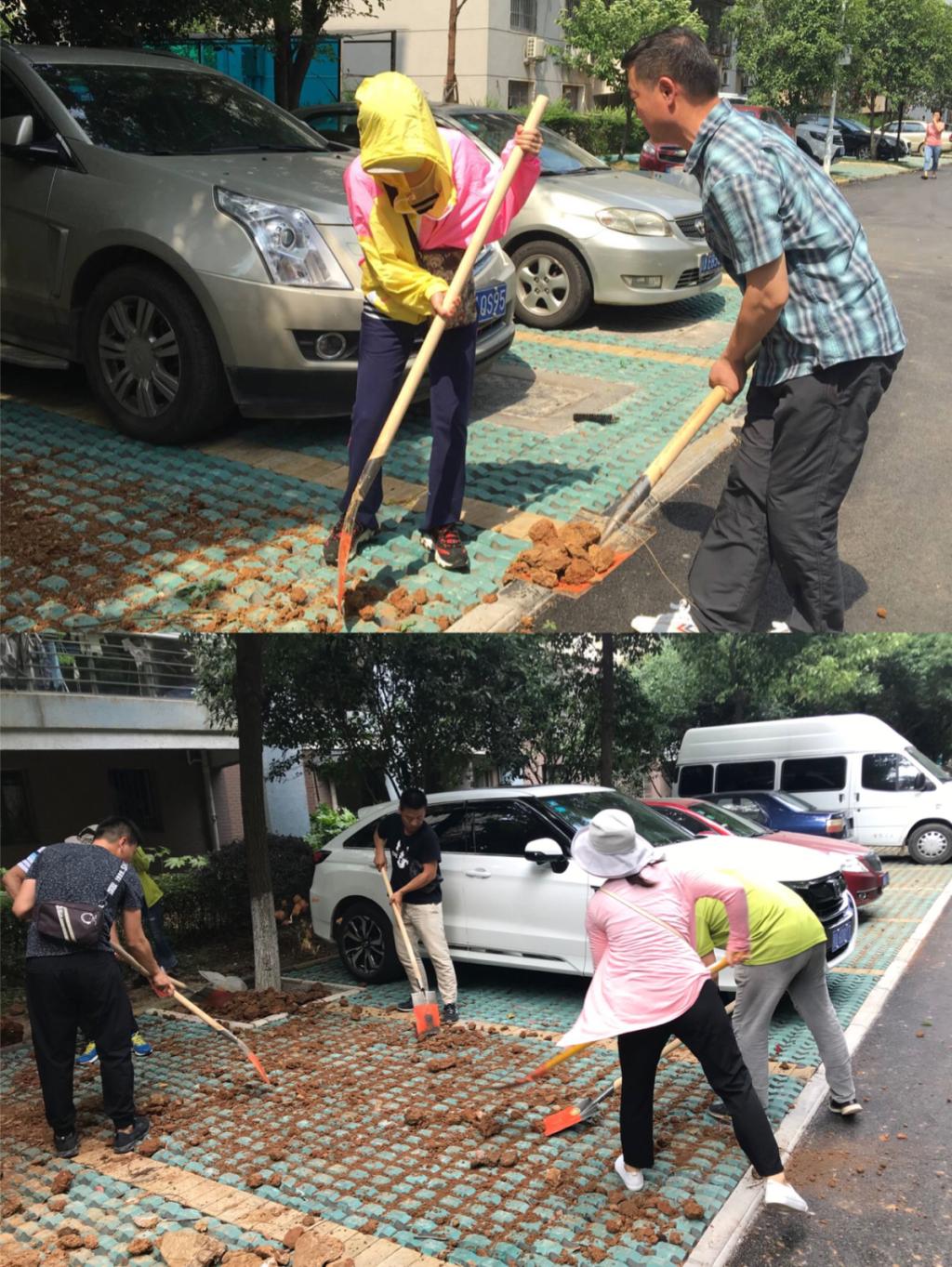 此次活动的主要任务是将小区停车位地砖之间的缝隙填上土,便于日后播撒草籽,为西苑绿化恢复进一步做准备。活动现场,管理人员分为3组,分别负责28栋、33栋和37栋的地砖填土工作。在烈日炎炎下,他们挥锹铲土、压锹碎土、握锹填土,每一道工序都完成得一丝不苟。经过三个小时的努力,小区近30个车位的地砖缝隙被填满,为西苑整体恢复赢得了时间。