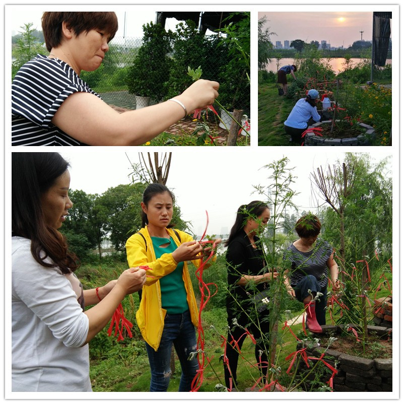 5月17日下午6时许,夕阳从厚重的云朵里射出最后的光芒,映在微微荡漾的野芷湖湖面上。天空飞着归巢的倦鸟,路上是匆忙回家的行人,而在蕙芷园里,一位剪了短碎发、身着黑白条纹衣衫的阿姨正半蹲在树池边,拿着一茬塔菊的枝丫,正在仔细地观察,一边比划,一边在讲着什么,举手投足显得尤为干练和严谨。旁边的一群年轻人正听得聚精会神,一会儿眉头紧锁,一会儿指手画脚,一会又眉开眼笑,场面严肃而活泼。