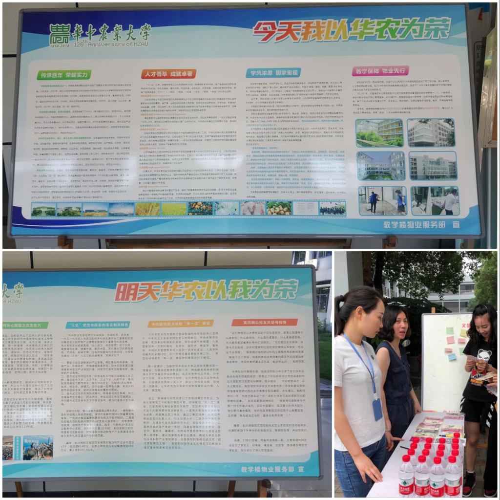 此次活动,教学楼物业项目部在半个月前就开始精心做准备,制作了1898年建校以来优秀校友的光辉履历的展板进行活动展示,定购了各类极具华中农业大学特色的校园精美纪念品,赠送给毕业生。考虑到天气炎热,同时还为参加活动的广大毕业生准备了瓶装饮用水。