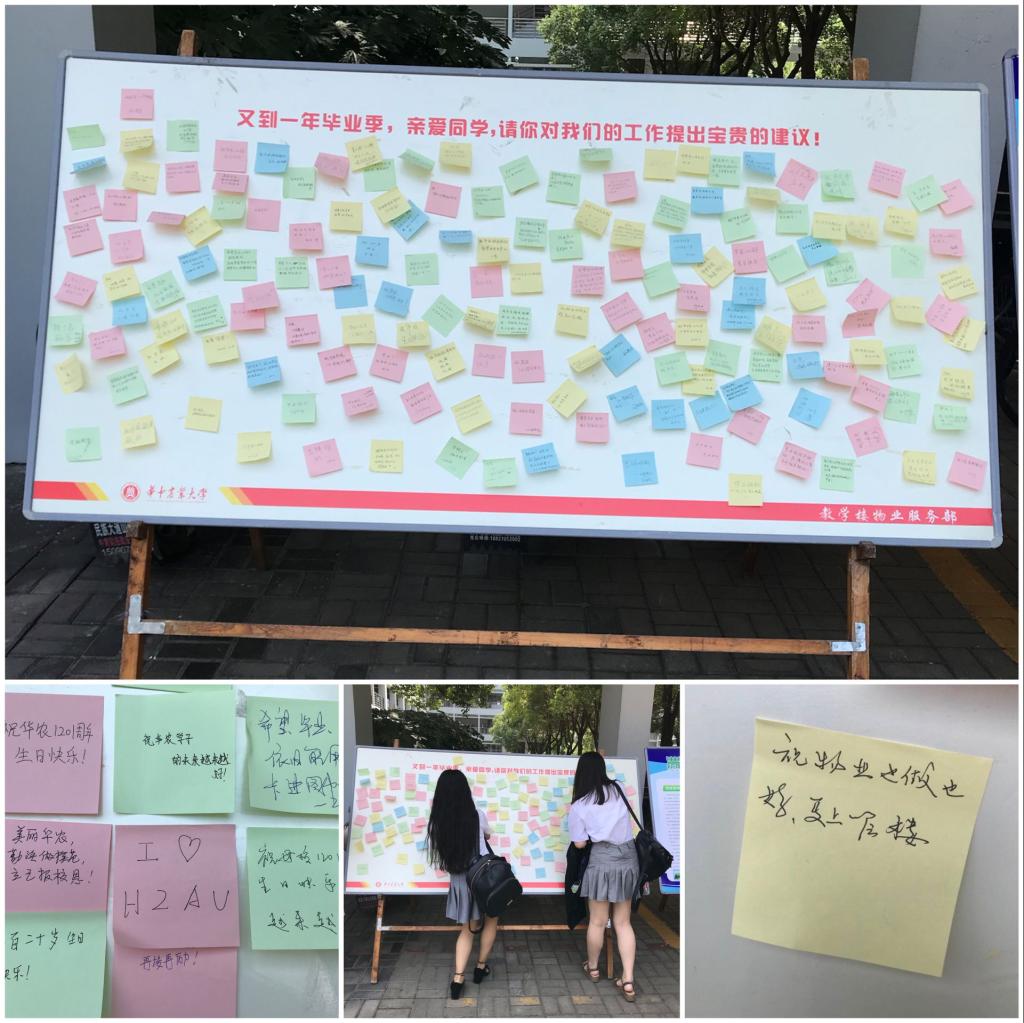 活动现场,物业工作人员请同学们给物业工作留下珍贵的意见及建议,写下毕业祝福。同学们热情高涨,纷纷在彩色便利贴上留下“祝物业越做越好,更上一层楼”“祝母校120周年生日快乐“等美好祝愿。